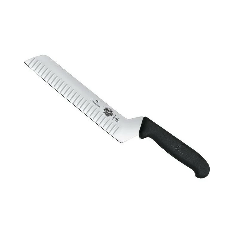 Couteau à beurre/fromage à pâte molle, lame large alvéolée 21 cm inox, manche fibrox noir.
