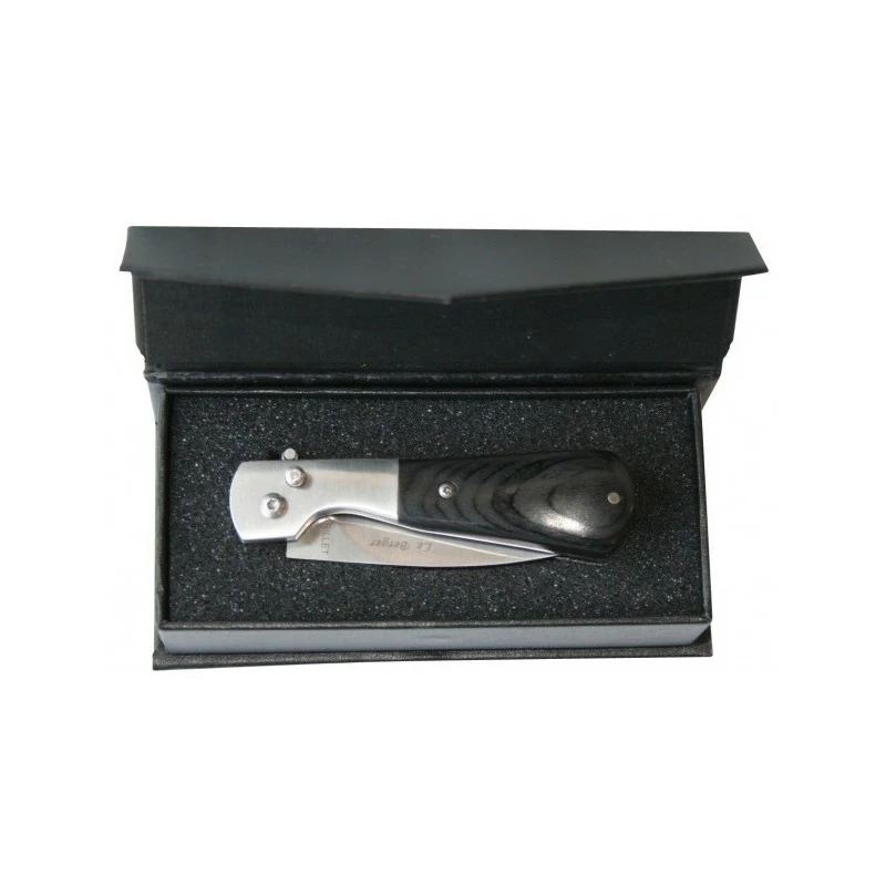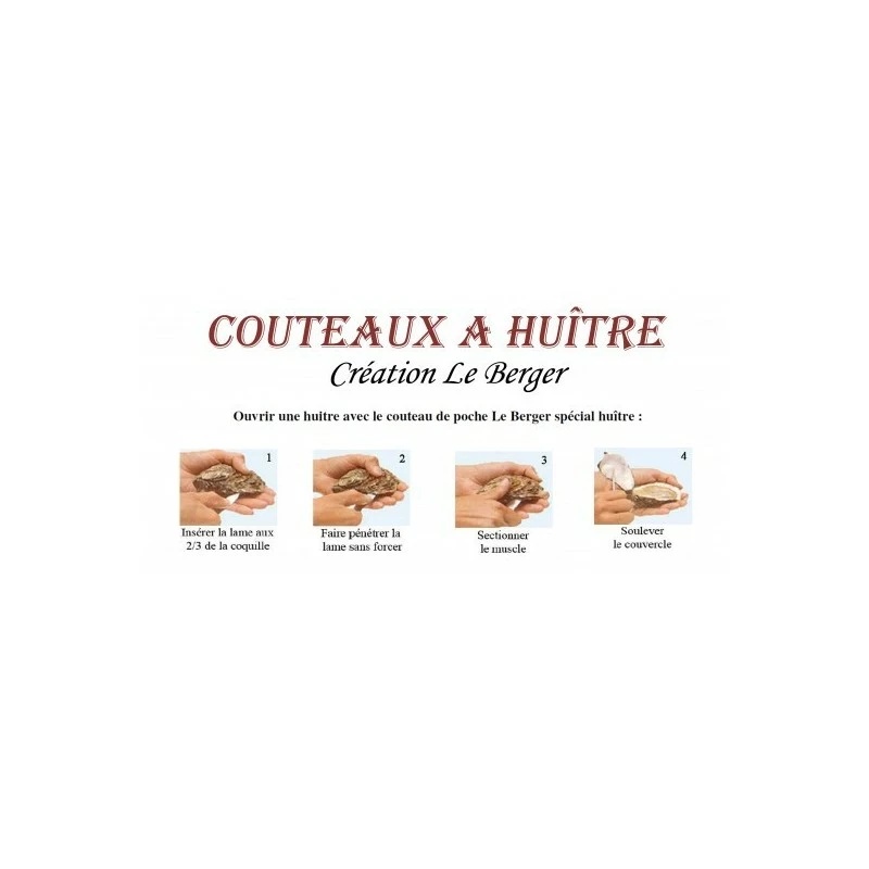 Coffret Cadeau Marqué Le Berger Couteau de poche spécial Huître ouverture AUTOMATIQUE, Mitres Inox, Manche Sta-wood Noir. Long ouvert : 155 mm