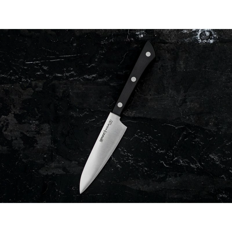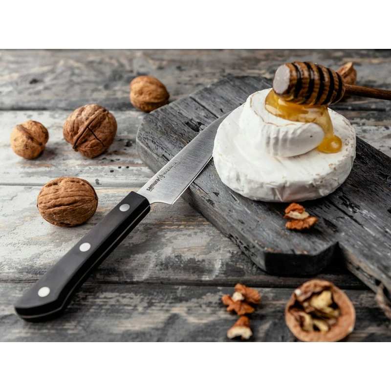 Le couteau à légumes Samura Harakiri est un petit couteau de cuisine au style japonais. La lame est en acier inoxydable AUS-8 de haute qualité. Ce type d’acier, originaire du Japon, est connu pour sa ténacité ainsi que de son tranchant durable. La lame s’étend jusque dans le manche, ce qui donne au couteau plus de force. La poignée est en ABS, un matériau léger mais durable et résistant. L’équilibre du couteau est à l’arrière afin qu’il tienne bien dans la main lors de la coupe. Ce couteau de cuisine Samura Harikiri sera parfait pour éplucher et couper les pommes de terre, les légumes et les fruits.