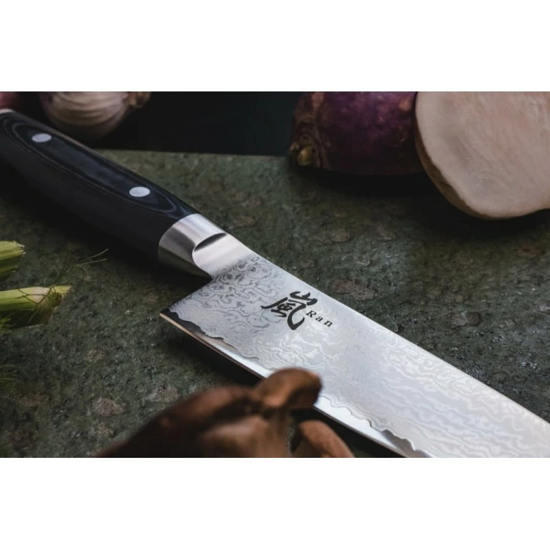 Couteau de chef japonais : la lame tient son tranchant exceptionnel à sa composition : acier VG10, dureté rockwell 60-62 HRC.