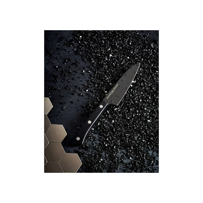 Le couteau d’office Samura SHADOW est muni d’une lame tranchante comme un rasoir fabriquée en acier AUS-8 avec un revêtement antiadhésif noir, qui empêche les aliments de coller pendant la coupe. Le manche léger en plastique ABS offre une prise en main sure et agréable.
