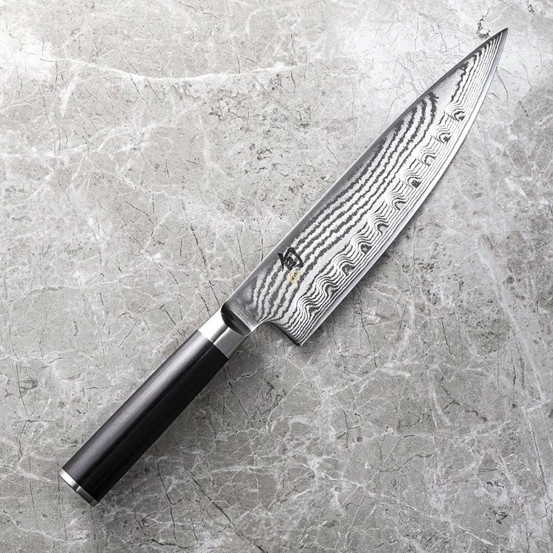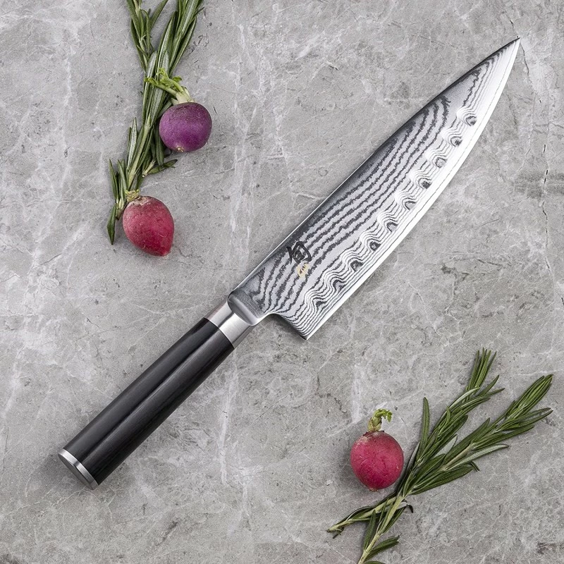 Le couteau de chef japonais KAI Shun Damas DM.0719 est muni d’une lame alvéolée de 20 cm de longueur en acier damas inox composé de 32 couches avec un noyau central en acier VG-10 (acier très dur, particulièrement résistant à la corrosion). À émouture symétrique, la lame de ce couteau japonais haut de gamme bénéficie d’un tranchant convexe ainsi qu’un affûtage manuel, ce qui lui procure un tranchant net et précis. Les alvéoles favorisent des coupes fines et nettes sur les pâtes molles et empêchent que les aliments ne se collent à la lame!