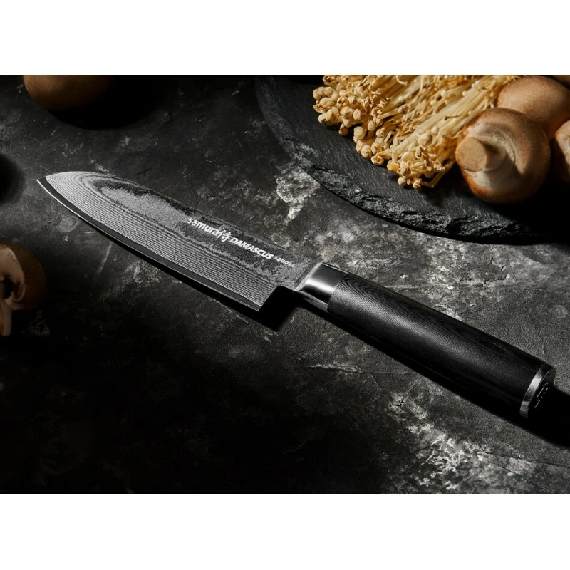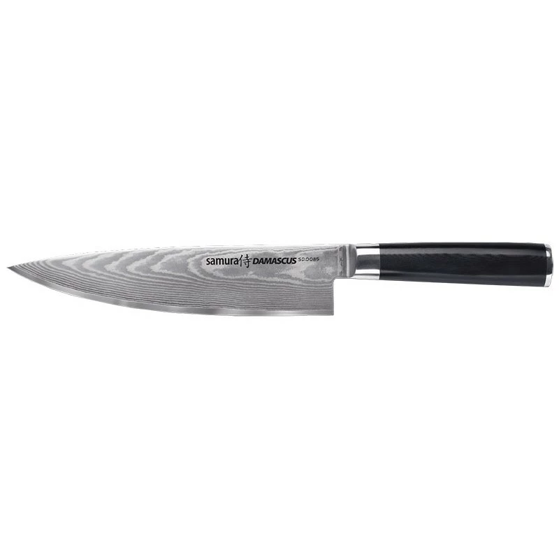Le couteau de chef japonais Samura Damascus est un couteau japonais de cuisine performant et durable. La lame de 20 cm de longueur est forgĂ©e de maniĂšre traditionnelle japonaise en acier damas 67 couches. Elle offre ainsi un tranchant nette et prĂ©cis. L’Ă©lĂ©gant manche en G10 de ce couteau de chef japonais procure une prise en main agrĂ©able ainsi qu’une haute rĂ©sistance Ă l’humiditĂ©. Il possĂšde un traversin en acier pour une plus grande durabilitĂ© et un contrĂŽle complet.