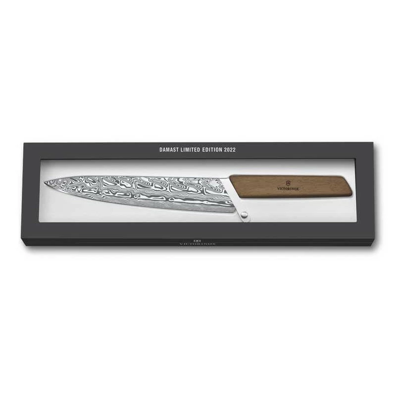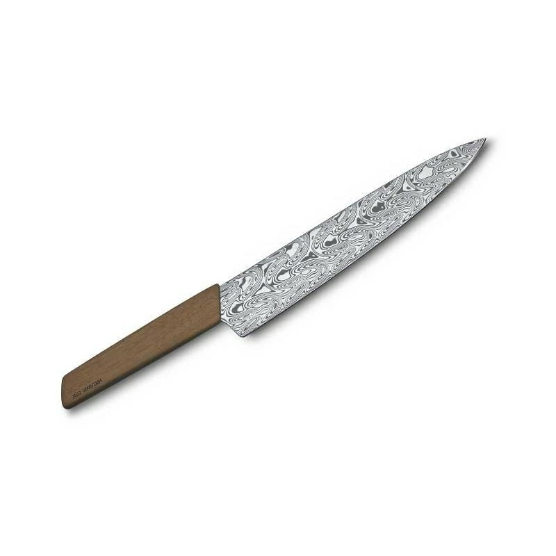 Le couteau de chef Victorinox damas de la série Swiss Modern est muni d’une lame Damasteel® avec son fascinant motif « Thor » qui ressort sur l’acier. Le manche est façonné en bois de noyer européen de couleur marron foncé. Chaleureux et ergonomique, il offre une prise en main aussi confortable que contemporaine et signe le renouveau du plus vieil outil de l’humanité. Cette couteau de cuisine unique et haut de gamme est présenté dans sa boîte cadeau accompagnée d’un certificat d’authenticité.