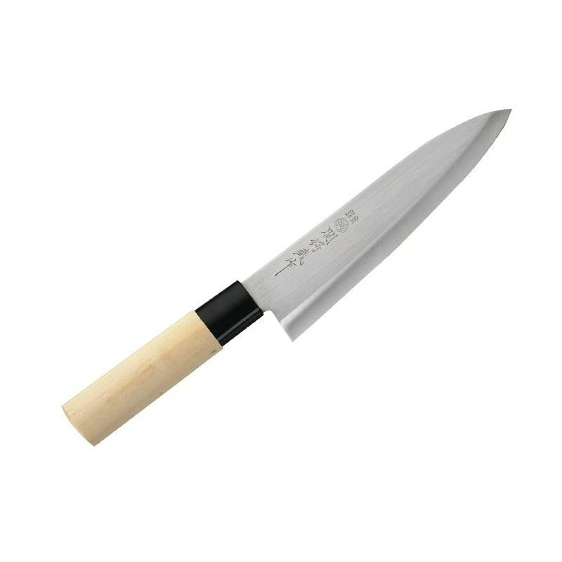 Couteau japonais de cuisine équipé d’une lame inox et d’un manche en bois naturel.