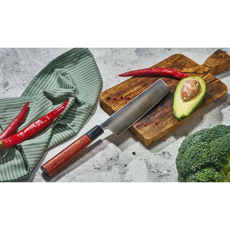 Le nakiri est le couteau à légumes japonais par excellence. Le couteau japonais nakiri Samura OKINAWA sera parfait pour hacher, émincer et trancher les légumes. Il conviendra également pour la préparation d’un tartare sur une viande sans os ou sur un poisson.