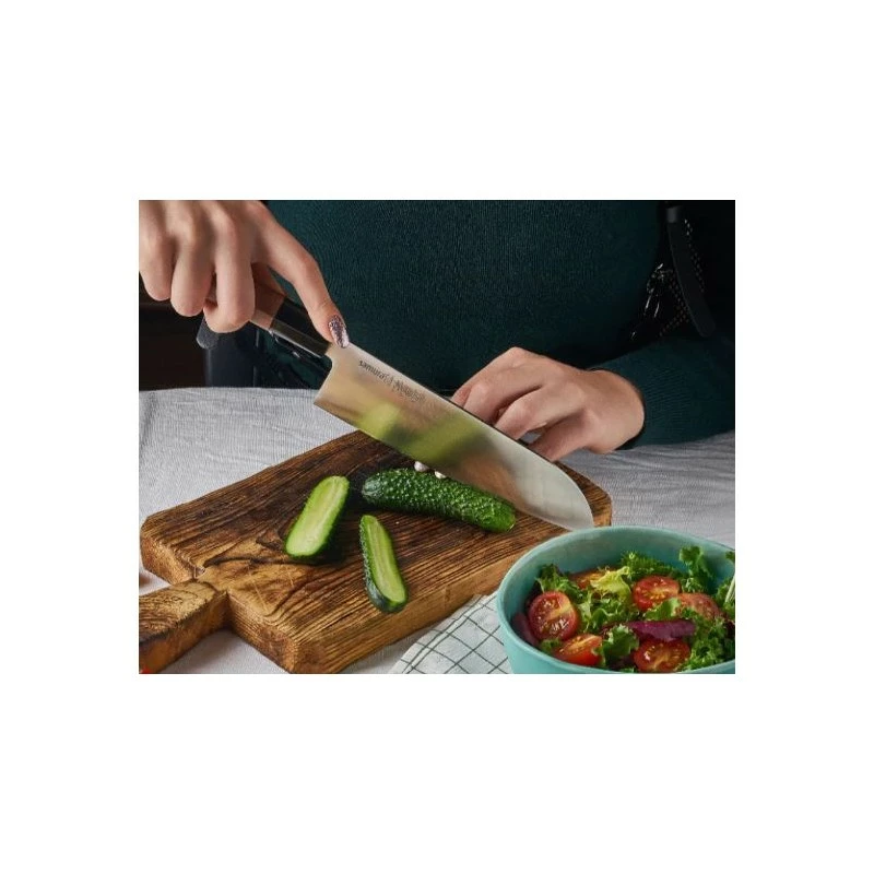Le santoku est le couteau de cuisine japonais d’usage général. Il convient notamment pour tailler finement les poissons crus et pour trancher, couper en dés et émincer les fruits et les légumes.