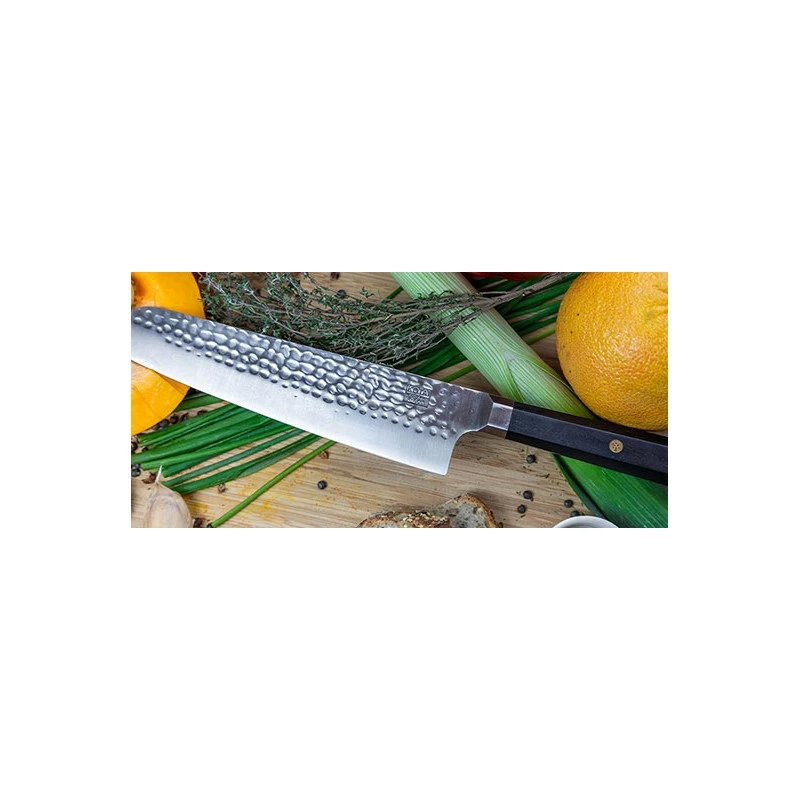 Le couteau Kiritsuke est le couteau préféré de nombreux chefs japonais. En effet, dans la plupart des restaurants gastronomiques, seul le chef de cuisine est autorisé à l’utiliser. Le couteau de cuisine Kiritsuke est donc souvent considéré comme un symbole d’expertise et de statut. Muni d’une lame haute, plate et pointue, le Kiritsuke est un couteau de cuisine polyvalent qui convient notamment pour émincer les légumes, découper des fruits, tailler la viande, trancher le poisson cru pour réaliser des sushis, etc.