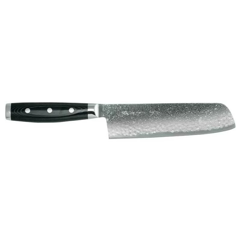 Le couteau nakiri Yaxell Gou a un noyau de coupe en acier inoxydable en poudre SG2 Micro-Carbide avec une super dureté de HRC63 sur l’échelle Rockwell. La lame de ce couteau japonais à 101 couches : 2×50 en aciers inoxydables à haute teneur en carbone + coeur de la lame en acier SG2. Un impressionnant motif en acier Damas et son nom japonais gravé à la fois sur la lame et sur l’extrémité de la poignée. La belle poignée noire Canvas-Micarta est fixée avec trois rivets en acier inoxydable. C’est un couteau remarquablement beau et artisanal qui offre des performances de coupe suprêmes. Le couteau nakiri convient pour découper les légumes.