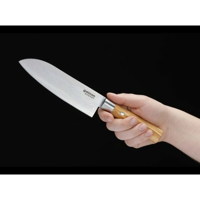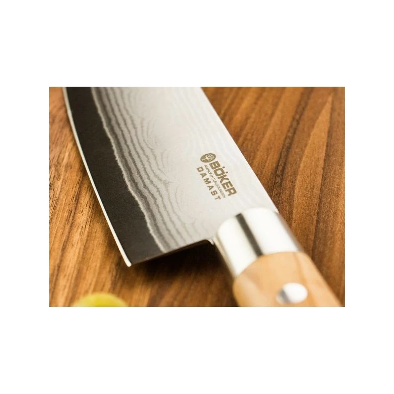 Ce couteau santoku de la gamme Boker Solingen Damascus Olive est caractérisé par son manche traditionnellement japonais en bois d`olivier et sa lame extrêmement tranchante en acier inoxydable Damas avec 37 couches d`acier, caractérisées par un grain magnifique. Le cœur de lame damas est constituée de l`acier haute performance VG-10 garantissant une résistance extrême. La netteté remarquable lors de la coupe est à couper le souffle et fait de la coupe et de la cuisine une véritable expérience.