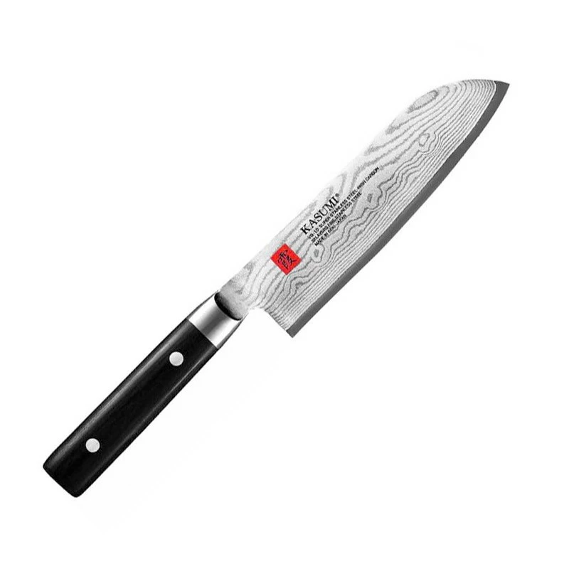 Le couteau santoku est le couteau japonais à tout faire en cuisine idéal notamment pour tailler finement la viande et les poissons crus et pour trancher, couper en dés et émincer les fruits et légumes.. Ce couteau santoku de Kasumi est doté d’une lame en acier damas VG10 – acier à haute teneur en carbone – procurant une coupe nette et précise grâce à son tranchant rasoir fin !