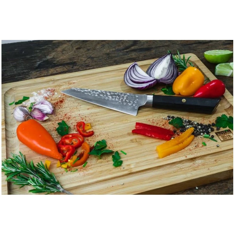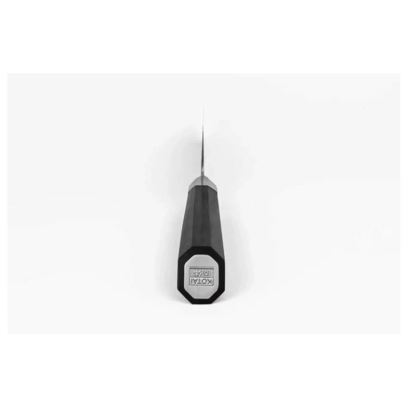 Le couteau petty japonais KOTAI Bunka est muni d’une lame reverse-tanto forgée en acier inoxydable japonais 440C à haute teneur en carbone aiguisée comme un rasoir. L’acier 440C combine une teneur élevée en carbone pour une dureté élevée et pour un tranchant durable avec une quantité optimale de chrome pour une bonne résistance à la corrosion. La répartition parfaite du poids et le manche en ébène poli à la main de ce couteau universel japonais ont été conçus pour permettre une découpe des aliments sans effort.